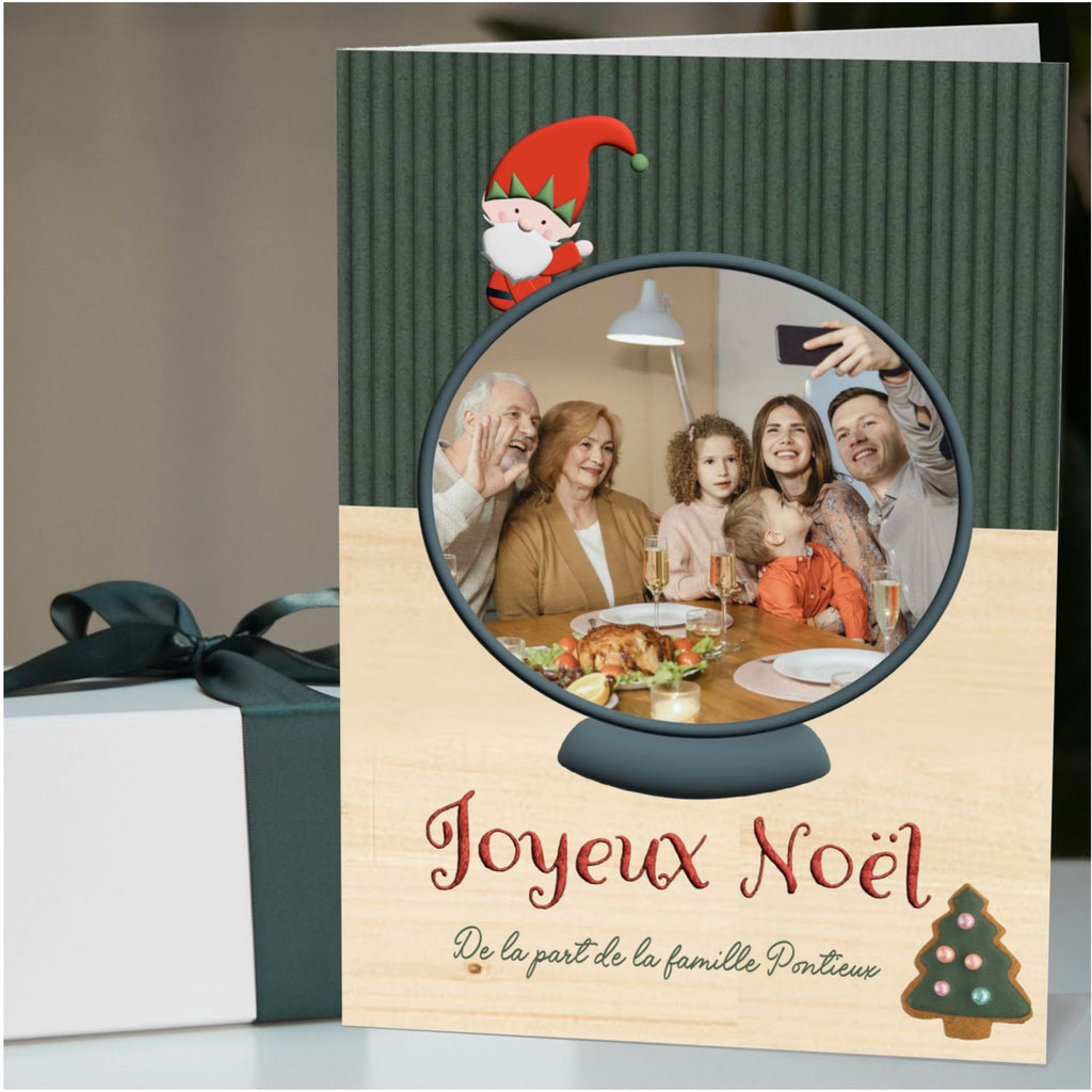 Sur un fond imitation bois, une bande supérieure effet velours accueille la mention “Joyeux Noël” en rouge, tandis que votre photo prend place dans une jolie boule à neige, accompagnée d’un texte personnalisé de votre choix.